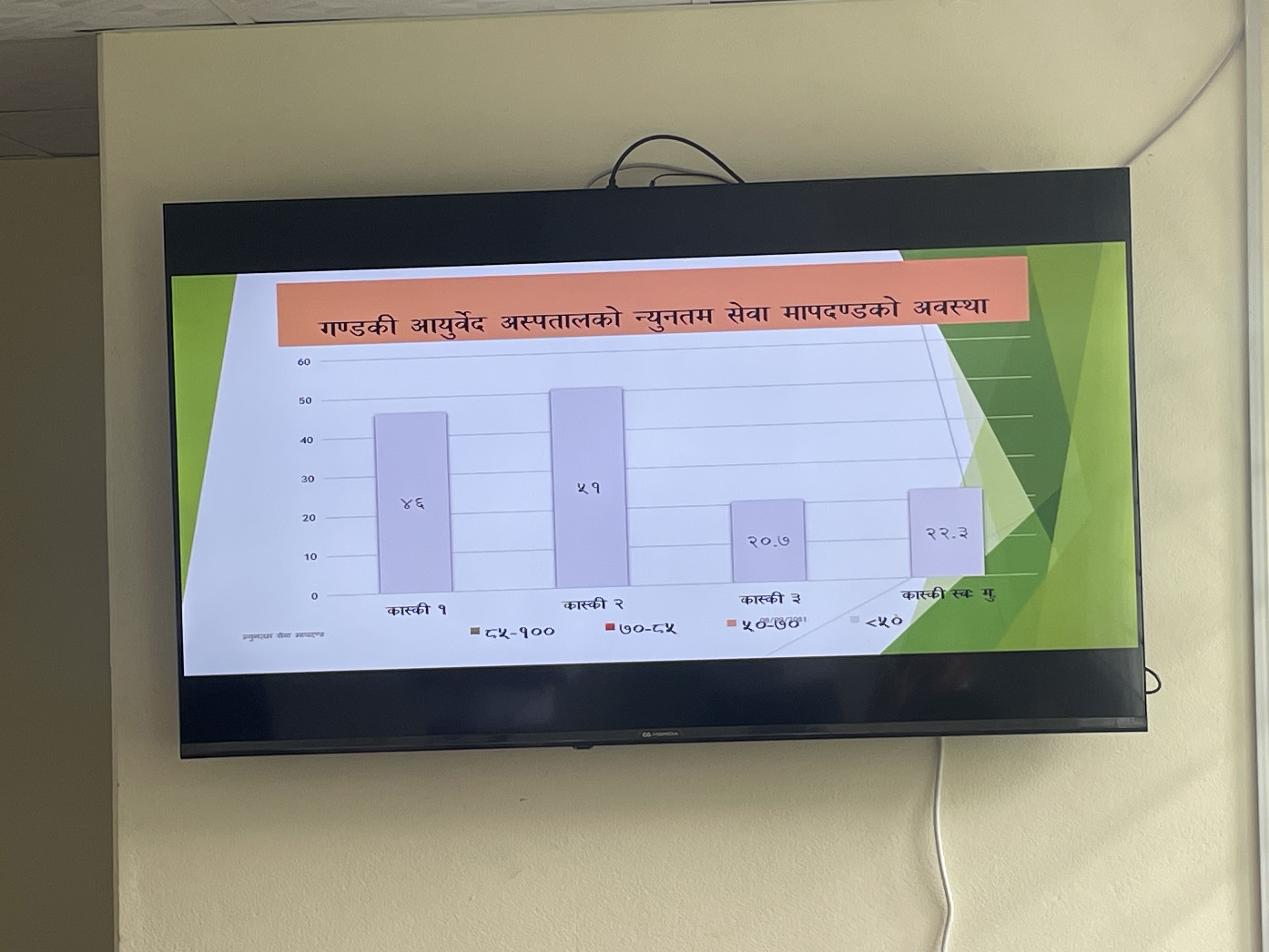 गण्डकी आयुर्वेद अस्पताल, कास्कीको न्यूनतम सेवा मापदण्डको लेखाजोखाबाट अस्पतालको हालको अवस्था र समस्याको पहिचान भई निरन्तर सेवा सुद्विधिकरण हेतु प्रदेश आयुर्वेद चिकित्सालय, लमजुङका प्रमुख डा.उत्सव पौडेल ज्युको सहभागितामा मिति २०८२/०५/२२ र २३ गते यस अस्पतालको आ.व.०८२/८३ को न्यूनतम सेवा मापदण्ड पहिलो स्वःमुल्याङ्कन सम्पन्न भएको छ । कार्यक्रम समापनको क्रममा प्रदेश आयुर्वेद चिकित्सालय, लमजुङका प्रमुख डा.उत्सव पौडेल ज्यूले प्रस्तुतिकरण सहित आवश्यक निर्देशन र सुझावहरु प्रदान गर्नु भएको थियो । आ.व.०८२/८३ को न्यूनतम सेवा मापदण्ड पहिलो स्वःमुल्याङ्कनमा गण्डकी आयुर्वेद अस्पतालले २२.६०% अंक प्राप्त गरेको छ ।
